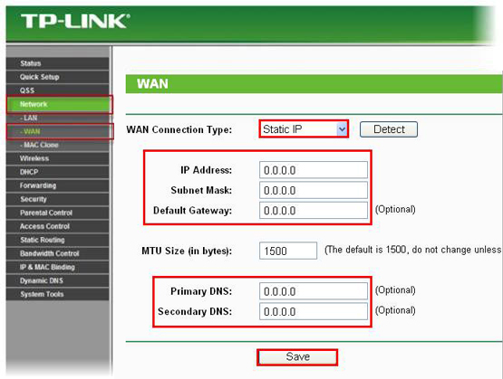 Зліва, в основному меню, вибираємо «Network», далі WAN і виставляємо параметри:
