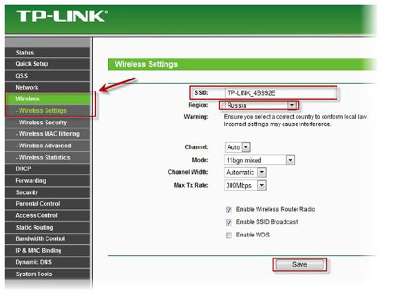 В інтерфейсі роутера необхідно вибрати вкладку «Wireless», в списку, вибираємо «Wireless Settings».