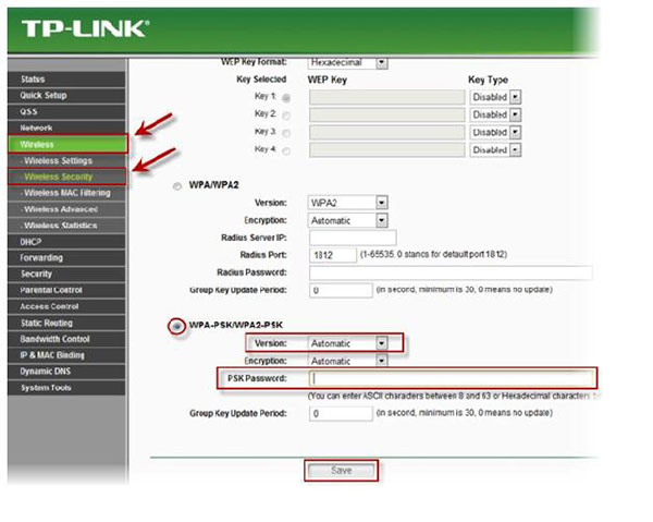 Далі, в меню «Wireless» вибираємо «Wireless Security» і виставляємо параметри: